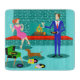 This Retro Couple with Dog Cutting Board looks like a scene out of a romantic comedy. The 1960s's style, minimalist art design features an attractive couple enjoying a romantic evening at home. The sophisticated room prominently features an aqua and teal brick fireplace with a bright red ledge. A beautiful, redhead woman wearing a bright, pink dress is perched on the ledge. She is enjoying a martini with a floating olive, a roaring fire, good music, and the company a tall, dark and handsome man. The man is wearing a blue suit and red tie. His martini glass is raised to toast his charming companion. In his other hand, he is holding a vinyl record album. At his feet, we see a most adorable dachshund wearing a red collar. The playful wiener dog is walking in the direction of a green record player with orange, spindle legs. On the floor, there is a colourful group of fun, eclectic, vinyl records. Cheers! Here's to the perfect evening at home.