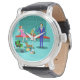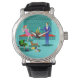 This Retro Couple with Dog Watch looks like a scene out of a romantic comedy. The 1960s's style, minimalist art design features an attractive couple enjoying a romantic evening at home. The sophisticated room prominently features an aqua and teal brick fireplace with a bright red ledge. A beautiful, redhead woman wearing a bright, pink dress is perched on the ledge. She is enjoying a martini with a floating olive, a roaring fire, good music, and the company a tall, dark and handsome man. The man is wearing a blue suit and red tie. His martini glass is raised to toast his charming companion. In his other hand, he is holding a vinyl record album. At his feet, we see a most adorable dachshund wearing a red collar. The playful wiener dog is walking in the direction of a green record player with orange, spindle legs. On the floor, there is a colourful group of fun, eclectic, vinyl records. Cheers! Here's to the perfect evening at home.