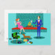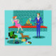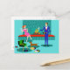 This Retro Couple with Dog Postcard looks like a scene out of a romantic comedy. The 1960s's style, minimalist art design features an attractive couple enjoying a romantic evening at home. The sophisticated room prominently features an aqua and teal brick fireplace with a bright red ledge. A beautiful, redhead woman wearing a bright, pink dress is perched on the ledge. She is enjoying a martini with a floating olive, a roaring fire, good music, and the company a tall, dark and handsome man. The man is wearing a blue suit and red tie. His martini glass is raised to toast his charming companion. In his other hand, he is holding a vinyl record album. At his feet, we see a most adorable dachshund wearing a red collar. The playful wiener dog is walking in the direction of a green record player with orange, spindle legs. On the floor, there is a colourful group of fun, eclectic, vinyl records. Cheers! Here's to the perfect evening at home.