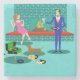 This Retro Couple with Dog Stone Coaster looks like a scene out of a romantic comedy. The 1960s's style, minimalist art design features an attractive couple enjoying a romantic evening at home. The sophisticated room prominently features an aqua and teal brick fireplace with a bright red ledge. A beautiful, redhead woman wearing a bright, pink dress is perched on the ledge. She is enjoying a martini with a floating olive, a roaring fire, good music, and the company a tall, dark and handsome man. The man is wearing a blue suit and red tie. His martini glass is raised to toast his charming companion. In his other hand, he is holding a vinyl record album. At his feet, we see a most adorable dachshund wearing a red collar. The playful wiener dog is walking in the direction of a green record player with orange, spindle legs. On the floor, there is a colourful group of fun, eclectic, vinyl records. Cheers! Here's to the perfect evening at home.