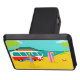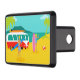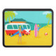 Chaque jour peut être un jour à la plage avec cette rétro couverture d'attelage de remorque de couples de surfer. Le style des années 1960, caractéristiques de conception minimalistes d'art un amusement-affectueux, exposent au soleil adorer, couple de recherche de frisson tout prêt à attraper une vague. L'arrangement est une oasis tropicale, d'île avec une plage du sable d'or, un balancement, des palmiers verts, un scintillement, océan de bleu de paon, et un ciel d'aqua. Dans la distance, nous pouvons voir une île volcanique turquoise, qui est dormante pour l'instant. De retour sur la plage, nous ne pouvons nous empêcher de noter le tour doux qui a apporté nos couples à leur destination rêveuse. C'est un fourgon moderne, rouge et blanc de la moitié du siècle avec une planche de surf orange et jaune attachée jusqu'au dessus. Bien que nous ne puissions pas être sûrs, il est juste pour supposer que l'intérieur du fourgon comporte super, pose de tapis de tapis à longs poils et l'odeur de l'encens ! Le type de surfer et le bébé de plage font soleil-embrasser l'assortiment se bronze, les cheveux soleil-blanchis, et le bleu, les maillots de bain modelés par tiki. Le type de surfer tient une planche de surf bleue. Le bébé de plage se tient près de elle deux-a modifié la tonalité, planche de surf rose. Se trouvant tout près, il y a un ballon de plage rouge et blanc, attendant pour accomplir son destin d'été. Attrapez quelques vagues et partagez un certain amour avec cette conception kitschy d'été !