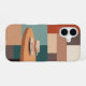 Stylized coffee cup on a rounded table, with curved steam and a geometric retro background.