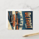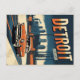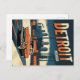A retro-themed travel poster for Detroit, Michigan, features an orange classic car driving on a road towards a cityscape with industrial buildings and factories under a dark blue sky with an orange gradient. "DETROIT" is prominently displayed at the top.