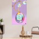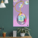 This image features a holographic, egg-shaped virtual pet device reminiscent of classic 90s Tamagotchis. It has a shimmering metallic gradient finish, three small round buttons, and a pixelated pet on the screen that appears to be calling for help. The device is attached to a beaded chain, which loops elegantly.