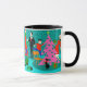 This Retro Family Trimming the Christmas Tree Mug contains every holiday tradition but the fruitcake. A 1960's cartoon family is at home in their mid century modern living room. There is a turquoise and teal brick wall and a red, cone fireplace with a roaring fire. Dad is wearing a black suit and red tie. He is hanging green Christmas stockings on the mod chimney with care. Next to dad, Junior is perched precariously on an orange chair. Whoa! Easy there, Junior! He is reaching out to put an ornament on a kitchy, pink, Christmas tree that is already decked out with teal ornaments and a yellow star. On the opposite side of the tree, Mom is holding a festively wrapped present. Hey, no shaking allowed! Mom is wearing a bright red wiggle dress with white trim. She is also wearing a Santa hat. Beneath the tree, there is a sleek black cat wearing a red bow. On the floor, there is a green and black record player surrounded by colourful vinyl albums. You just know that the family is singing along with their favourite Christmas carols while they are decking the halls.
