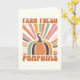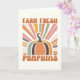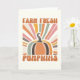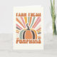 This vibrant and retro-inspired fall design highlights the phrase "Farm Fresh Pumpkins" in bold, playful typography that immediately grabs attention. At the centre of the design is a large, stylized pumpkin, depicted in warm autumnal shades of orange, brown, and cream. The pumpkin is framed by a dynamic burst of colourful rays extending outward, featuring a palette of muted oranges, pinks, yellows, and greens that add a nostalgic, vintage feel to the design. The combination of the sunburst pattern and the chunky, curvaceous font gives the artwork a fun and energetic vibe, perfect for capturing the festive spirit of fall.