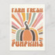 This vibrant and retro-inspired fall design highlights the phrase "Farm Fresh Pumpkins" in bold, playful typography that immediately grabs attention. At the centre of the design is a large, stylized pumpkin, depicted in warm autumnal shades of orange, brown, and cream. The pumpkin is framed by a dynamic burst of colourful rays extending outward, featuring a palette of muted oranges, pinks, yellows, and greens that add a nostalgic, vintage feel to the design. The combination of the sunburst pattern and the chunky, curvaceous font gives the artwork a fun and energetic vibe, perfect for capturing the festive spirit of fall.