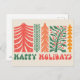 This vibrant holiday card embraces a retro design featuring a series of stylized trees in shades of red, orange, and green, each with its own unique, decorative pattern. The trees are adorned with stars, berries, and festive branches, evoking a sense of holiday cheer and whimsy. The words "Happy Holidays" are displayed in bold, playful font at the bottom, adding a nostalgic touch to this delightful design. Perfect for sending joyful greetings during the festive season with a vintage flair.