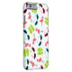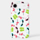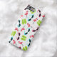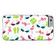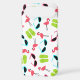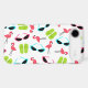 An iPhone 6 case featuring a pattern consisting of pink flamingos, green flip flops, and retro blue cat eye sunglasses.