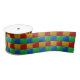 The colourful, original pattern by ZoeSPEAK on this Satin Ribbon was made from Zoe’s original closeup photograph of a leaf. The leaf is done in four colours, red, blue, green and yellow, and assembled as square tiles to form the overall design. The pattern gives a retro nod to the linoleum tile floors of the 1950’s.