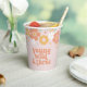 Retro inspired floral Young Wild and Three 3rd birthday cups with 70's style flowers and boho fonts and colours.