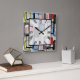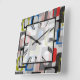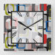 10.75” x 10.75” square acrylic wall clock with a fun 50s-style image of blue, green, black and grey striped frames, red striped rectangles, black plaid rectangles, solid red and white rectangles, and grey squares on grey. Easy-to-read Roman numeral clock face on white transparent square with black border. See the entire Nifty 50s Clock collection in the DÉCOR | Clocks section.