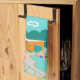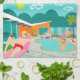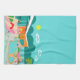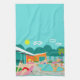 This Retro Gay Pool Party Kitchen Towel design features four hunky beefcakes having a gay old time as they beat the Palm Springs heat by lounging around the turquoise blue water of their atomic boomerang shaped swimming pool. The mid century modern architecture on the fabulous, orange stone house is clearly prime real estate, given the view of the mountains in the background. A yellow starburst sun shines brightly in the turquoise sky so you are able to see every charming detail--from the kitschy, pink flamingos to the 1950’s striped, breezy blocks fence. And of course what Palm Springs House would be complete without a palm tree?