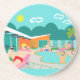This Retro Gay Pool Party Sandstone Coaster features four hunky beefcakes having a gay old time as they beat the Palm Springs heat by lounging around the turquoise blue water of their atomic boomerang shaped swimming pool. The mid century modern architecture on the fabulous, orange stone house is clearly prime real estate, given the view of the mountains in the background. A yellow starburst sun shines brightly in the turquoise sky so you are able to see every charming detail--from the kitschy, pink flamingos to the 1950’s striped, breezy blocks fence. And of course what Palm Springs House would be complete without a palm tree?