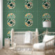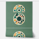 A vibrant geometric artwork featuring circular patterns in shades of teal, orange, and brown. The retro design has a vintage feel with playful shapes and a minimalist tree element in the lower section.