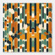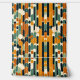 A vibrant retro-inspired geometric design featuring bold orange, green, and black shapes. The abstract arrangement of rounded lines and circles creates a dynamic, vintage aesthetic.