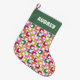 Add some joy to your Christmas gifts with this patterned stocking featuring a simple geometric pattern in a retro 1970s colour palette of red, lime green, orange, pink and green against a white background. Your name appears at the top in retro style white lettering against a green background.