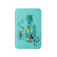 It looks like it’s going to be a fun time with this kitschy Retro Girls’ Night In Bath Mat. The 1960’s style, minimalist art design features two women with pink cocktails in a thoroughly mid century modern, aqua and turquoise living room. These ladies certainly know how to relax. The raven haired beauty in the flirty, green dress is lounging on the atomic sofa. Her blonde companion is sitting on a zebra print rug, wearing a red top and tight, black pants. The vintage, vinyl record player and paper lantern light fixtures set the mood. A framed, space age, globe art print hangs above the mod sofa.