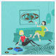 It looks like it’s going to be a fun time with this kitschy Retro Girls’ Night In Fabric. The 1960’s style, minimalist art design features two women with pink cocktails in a thoroughly mid century modern, aqua and turquoise living room. These ladies certainly know how to relax. The raven haired beauty in the flirty, green dress is lounging on the atomic sofa. Her blonde companion is sitting on a zebra print rug, wearing a red top and tight, black pants. The vintage, vinyl record player and paper lantern light fixtures set the mood. A framed, space age, globe art print hangs above the mod sofa.