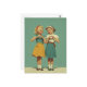 Two vintage-styled girls stand side by side, forming heart shapes with their hands. Their bright dresses—one golden yellow, one teal—pop against the clean turquoise backdrop. With sweet expressions and nostalgic charm, the scene captures innocence, friendship, and playfulness, evoking the warmth of classic mid-century illustrations.