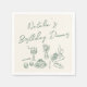 As you see this unique and elegant birthday dinner napkin has a well designed template. With green hand drawn brunch tableware of , floral bouquet, candles, cake, wine bottle and glass, grapes, knife and fork and whimsical hand written name. All on cream background . Which you can customize easily by clocking on the personalize button.