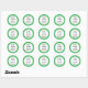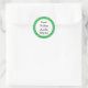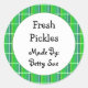 A custom canning or baking sticker with handwritten style script and block letters on a retro green plaid pattern with small white and blue stripes for pickles, jams or other recipes.