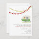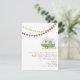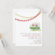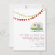 A wedding rehearsal dinner invitation featuring an illustration of a green vintage trailer with a window box full of daisies and black eyed susans. Red and yellow bunting at top. Personalize the text.