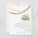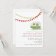 A wedding invitation featuring an illustration of a green vintage trailer with a window box full of daisies and black eyed susans. Red and yellow bunting at top. Personalize the text.