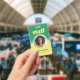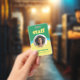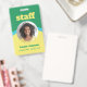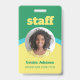 One-sided vertical ID badge for your staff in a retro design in green, yellow, and blue. Personalize with your employee's photo, name, and title beneath staff in a bold eye-catching yellow font. The badge is simple and easy to read, printed without logo, in bold and happy colours.