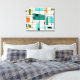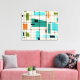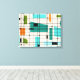 This Retro Grid and Starbursts Wrapped Canvas is where vintage style meets modern day. It features a cream coloured background with kitschy, off kilter squares and rectangles in teal, turquoise, This light blue, orange, and avocado green. The whimsical blocks of colour are overlayed are worked into some of the grid intersections. There are also black rectangles with black vertical and horizontal lines forming a grid pattern. Black starburst designs and squares placed sporadically throughout this mid century modern tapestry of colour. Grab your go-go boots and bell-bottoms and enjoy this throwback to the 1960s.