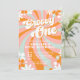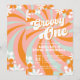 Groovy One First Birthday Invitation with retro pink, green, orange burst with daisy flower accents and Groovy One in retro hippie style lettering.
