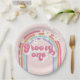Groovy One! Retro inspired 1st birthday plates with 70's style fonts and colours, rainbow, and daisies in bright pink and purple colours.