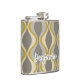 A mod patterned gold flask with a place for a simple monogram. The taupe, grey and gold design has a groovy organic wave pattern. A minimal look in subtle colours with a simple serif font for a monogram.