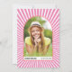 Retro groovy pink sunrays 70s inspired Graduation Party Invitation. The front showcases an arch shape in two shades of pink and white, creating a visually appealing contrast. Adding to the retro vibe, a sunray pattern is incorporated behind the arch, giving it a unique and eye-catching look. To complete the 70s feel, the phrase 'Grad Party' is written in a retro font, adding an authentic touch to the overall design. On the back of the invitation, a vintage aesthetic is brought to life with a photo of the graduate placed within the same arch shape.