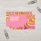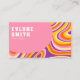 A Vintage retro Psychedelic colourful liquid business card. That features a handmade groovy pattern boho abstract wavy shapes lines .In elegant chic purple and pink and yellow and orange . Modern yet it has nostalgic seventies vibes and colours and groovy fonts. With customizable name and profession and QR code.