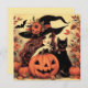 Here's a retro looking Halloween card that features a pretty witch in a pointy witch hat with a black cat amd a pumpkin. There is a in the background along with autumnal leaves. The card has a distinctly 60s or 70s vibe. It's a cool card to use as an invitation, as a greeting card or as a card to give with a gift. This card will be appreciated by anyone who likes spooky stuff, retro and vintage art and illustrations and witches.