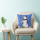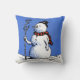 Add some classic holiday cheer to your home with this charming vintage-inspired snowman throw pillow. The design features a delightful hand-drawn snowman, complete with a top hat and a cozy red and black striped scarf. The unique stippled blue shading gives it a nostalgic, retro feel against the bold blue winter sky.