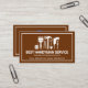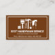 An all dark brown cover features a creative handyman tools design that is encapsulated by a white rectangle border frame. Just below this tools design lies your business name and a slogan option to publicize your services. ; You can change the caption remarks to the slogan to suit your own service needs. The contact details can be found near the base of the card.