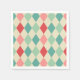 Enjoy a fun retro look reminiscent of the circus with this harlequin design in shades of teal, mint, red, pink and beige. Shown here with simply the harlequin pattern, this napkin is also available in a personalized version for birthday parties and other events.