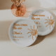 As you see this unique and elegant summer here comes the sun shower paper plate has a well designed template. With orange hand drawn sun hand written name and date in orange. And cream boho background . Which you can customize easily by clocking on the personalize button.