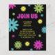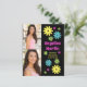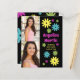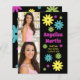 Fun retro hippie-style budget graduation party invitation with colourful pink, teal, green, and yellow flowers on a black background along with 2 of your favourite photos. This card is designed on both front and back. The front of the card has your photos, graduate's name, school name, and graduation year, and the back has your party information.