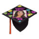 Fun retro hippie-style square graduation graduation cap topper with colourful pink, teal, green, and yellow flowers on a black background along with your favourite photo. Personalize with your name and graduation year. Contact me for assistance with your customizations or to request additional matching or coordinating Zazzle products for your graduation.