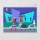 This Retro Holiday Cartoon Party Christmas Postcard will put you in the holiday spirit. The design features the exterior of a mid century modern house. Through the floor to ceiling turquoise glass walls, we can see the navy blue silhouettes of festive party goers. There is a couple chatting in front of a green Christmas tree, which is decorated with teal ornaments. On the opposite side of the room, we can see a dancing man and the long-winded man everyone is trying to avoid. The exterior of the house features a cheery red door with a holiday wreath, an oversize purple brick fireplace, and strands of colourful Christmas lights. A grey walkway is cutting a swath to the front door, through the teal grass. The nighttime scene has a dark blue sky with a yellow, crescent moon. The plastic snowman decorating the front yard is being greeted by the first snow flurries of the season. An attractive couple is doing the cha-cha-cha on the way to their car. The blonde woman is wearing a bright red dress. She is holding a sprig of mistletoe in one hand. Her handsome escort is wearing a black suit and a red tie. His hands are wrapped around the woman's waist. On the street, in front of the house, we can see three, brightly coloured classic cars. Order today and party like it's 1959!