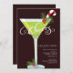 Fun CHEERS! Retro Holiday Cocktail Party Invitation featuring a green martini glass with a red & white stripe candy cane stirrer and a holly leaf with berries on the stem.