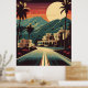The image depicts a stylized illustration of a scenic Hollywood view. The colour palette is warm with a retro vibe, featuring shades of orange, red, yellow, and teal. In the foreground, there's a road that leads towards the horizon, marked with white lines that suggest motion blur, giving a sense of depth and movement.