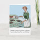 A vintage image of a retro housewife from the 1950s or 1960s. She's standing in front of her turquoise stove, wearing a dress and apron, and holding a small pot over one of the stove burners. She smiles sweetly, turns and says to her husband, "Darling, I know you’d love a relaxing, home cooked meal for your birthday." On the inside of the card: "So I called your mom."