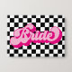 Create your own retro style hot pink and pink "Bride" typography against a customizable chequerboard pattern on a rectangular pinback button for your bachelorette party.
