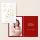 This pretty personalized Christmas card combines the best of modern Holiday card trends. The front features an artistic Christmas tree and star swirl design in gold foil, with a shower of snowflakes around it. There are two text fields for you to customize. The inside of the front has your 5 x 7 photo, bordered in bright red, which can be displayed throughout the year. The inside back is also red, with two more custom text fields. Make it say whatever you'd like!