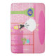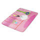 This Retro In the Pink Bath Mat looks like a scene out of a 1960's romantic comedy. The minimalist design shows a sophisticated woman in her ultra kitschy and ultra pink, penthouse apartment. The room features a pink brick wall with white grout lines. In front of the wall, there is a green cone fireplace with a roaring fire. Through sliding glass doors we see a pink balcony with a white railing. A lush, tropical plant is in an aqua flowerpot. The view from the balcony is of a silhouette of a big city skyline. Of course, the silhouette is in shades of pink! A yellow, crescent moon is in the sky. Standing on a hot pink, shag rug in the apartment is the leading lady of this design. In stark contrast to the rosy world she has created, the beautiful blonde is wearing a form fitting, black, scoop-necked top with a long, flared, white skirt with black feather embellishments. With this design, you too can be looking at the world through rose coloured glasses!