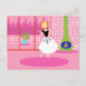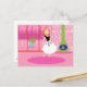 This Retro In the Pink Postcard looks like a scene out of a 1960's romantic comedy. The minimalist design shows a sophisticated woman in her ultra kitschy and ultra pink, penthouse apartment. The room features a pink brick wall with white grout lines. In front of the wall, there is a green cone fireplace with a roaring fire. Through sliding glass doors we see a pink balcony with a white railing. A lush, tropical plant is in an aqua flowerpot. The view from the balcony is of a silhouette of a big city skyline. Of course, the silhouette is in shades of pink! A yellow, crescent moon is in the sky. Standing on a hot pink, shag rug in the apartment is the leading lady of this design. In stark contrast to the rosy world she has created, the beautiful blonde is wearing a form fitting, black, scoop-necked top with a long, flared, white skirt with black feather embellishments. With this design, you too can be looking at the world through rose coloured glasses!